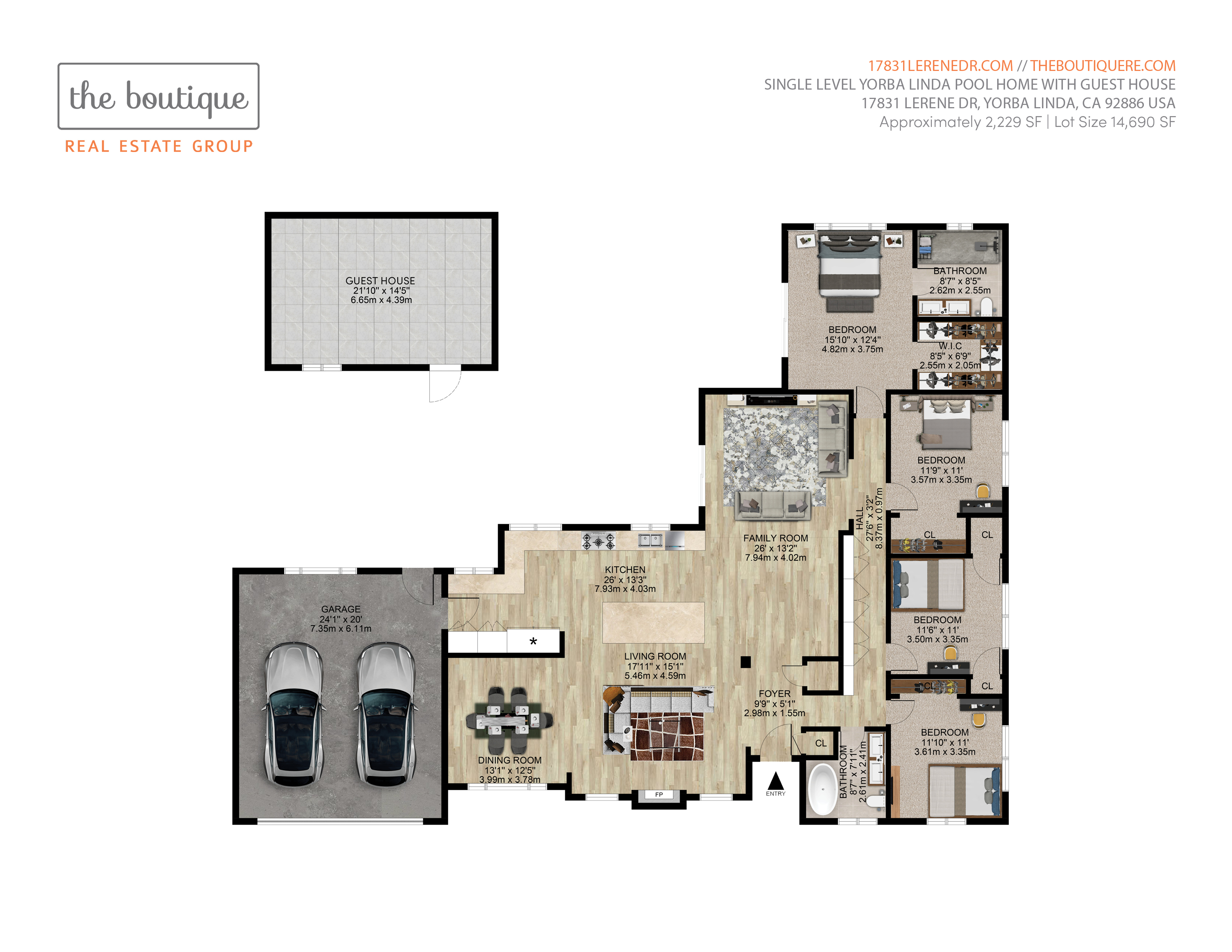 Welcome to 17831 Lerene Drive, a beautifully remodeled single-level pool home situated on a serene cul-de-sac in the heart of Yorba Linda. This remarkable residence offers an abundance of living space, boasting approximately 2,229 square feet in the main home, along with a separate 330 square foot guest house complete with a bathroom, kitchenette, closet, and breathtaking pool views.