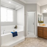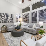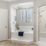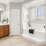 Entertainment abounds with a media center featuring custom cabinetry in the family room, enhanced by plantation shutters and an upgraded interior lighting package. The primary bedroom offers peek-a-boo views and an en-suite bathroom with dual vanities, an oversized tub, shower enclosure, and walk-in closets.