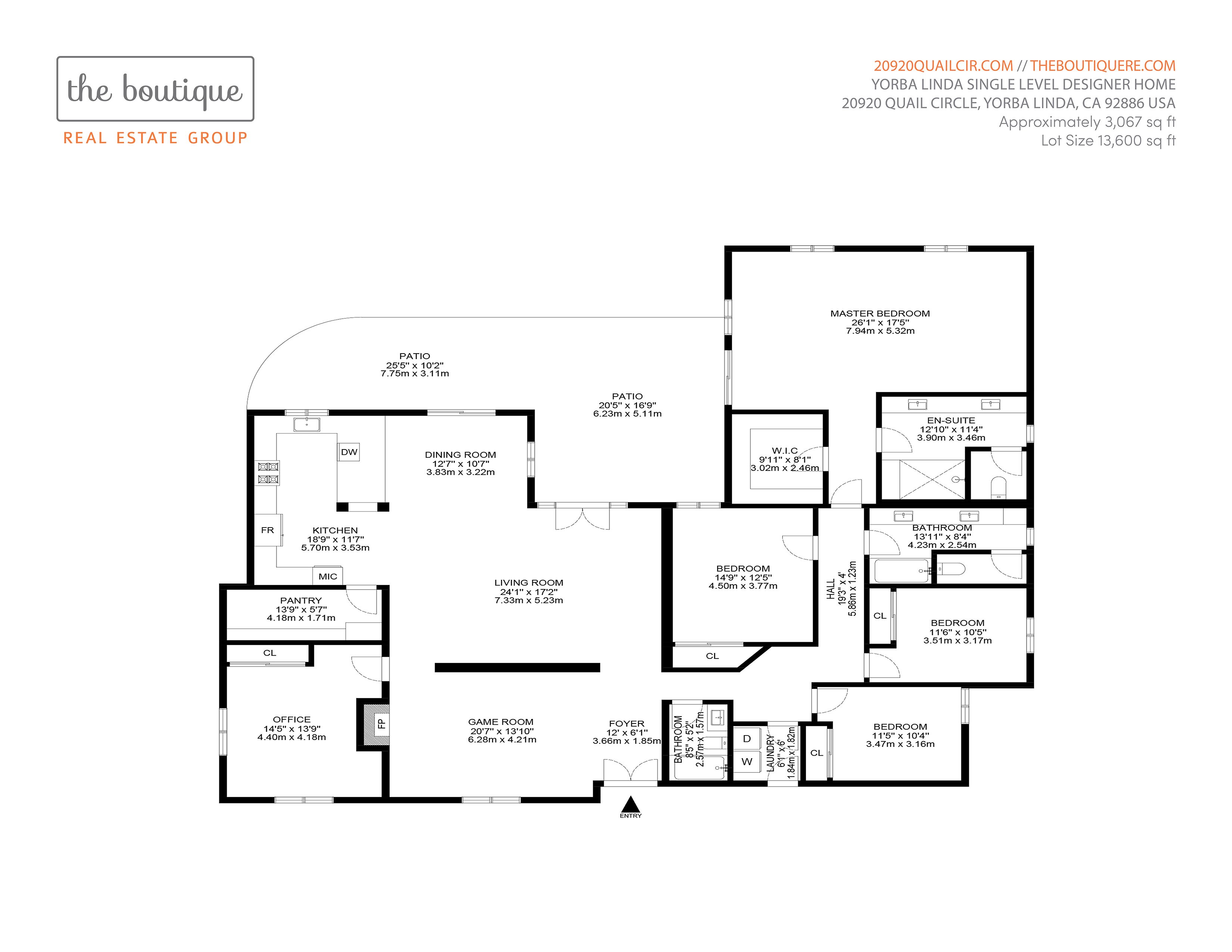Welcome to 20920 Quail Circle, beautifully remodeled in 2018/2019 and is a true single-level estate home with NO INTERIOR STEPS situated on a serene cul-de-sac in the heart of Yorba Linda. This remarkable residence offers an abundance of living space, boasting approximately 3,067 square feet. Inside the home, you'll discover five spacious bedrooms, an open floor plan, three full bathrooms, a three-car garage, and a sprawling 13,600-square-foot corner lot. The outdoor space is a true oasis, featuring a lush grassy area, wrap around yard and massive curb appeal all on a corner lot on 1/3 acres. The chef-inspired kitchen is a culinary enthusiast's dream, showcasing stone countertops, a custom tile backsplash, a sizable breakfast bar, pendant lighting, premium stainless-steel appliances, and ample storage space in the walk in butler’s pantry. The large windows flood the kitchen with natural light, offering stunning views of the expansive entertainer’s backyard. This home has undergone many recent updates, including European oak flooring, new lighting, a gorgeous stone fireplace, remodeled kitchen & bathrooms, and upgraded fixtures. You will love the massive driveway and three-car-attached garage with custom built-in storage. Ideal for entertaining, the backyard presents an entertainer's paradise with its generous 1/3 acre lot, large grassy area, mature trees, and ample space for gatherings with family and friends with plenty of room for a pool and outdoor kitchen. Conveniently located, this property offers proximity to Black Gold Golf Course, Yorba Linda Country Club, Yorba Linda Town Center, the Yorba Linda Library, and Savi Ranch Shopping Center. For families, this home falls within the desirable school district, with top-rated schools such as Fairmont Elementary, Bernardo Yorba Middle School, and Yorba Linda High School. Enjoy the annual festivities at Veterans Park on the 4th of July or indulge in the Lobster Fest at the nearby Yorba Linda Community Center. With no Mello Roos or HOA fees, this is an incredible opportunity to own a stunning home in Yorba Linda that perfectly balances luxury, privacy, and convenience. Don't miss out on making this home your own and seize the chance to enjoy a lifestyle defined by elegance and comfort.