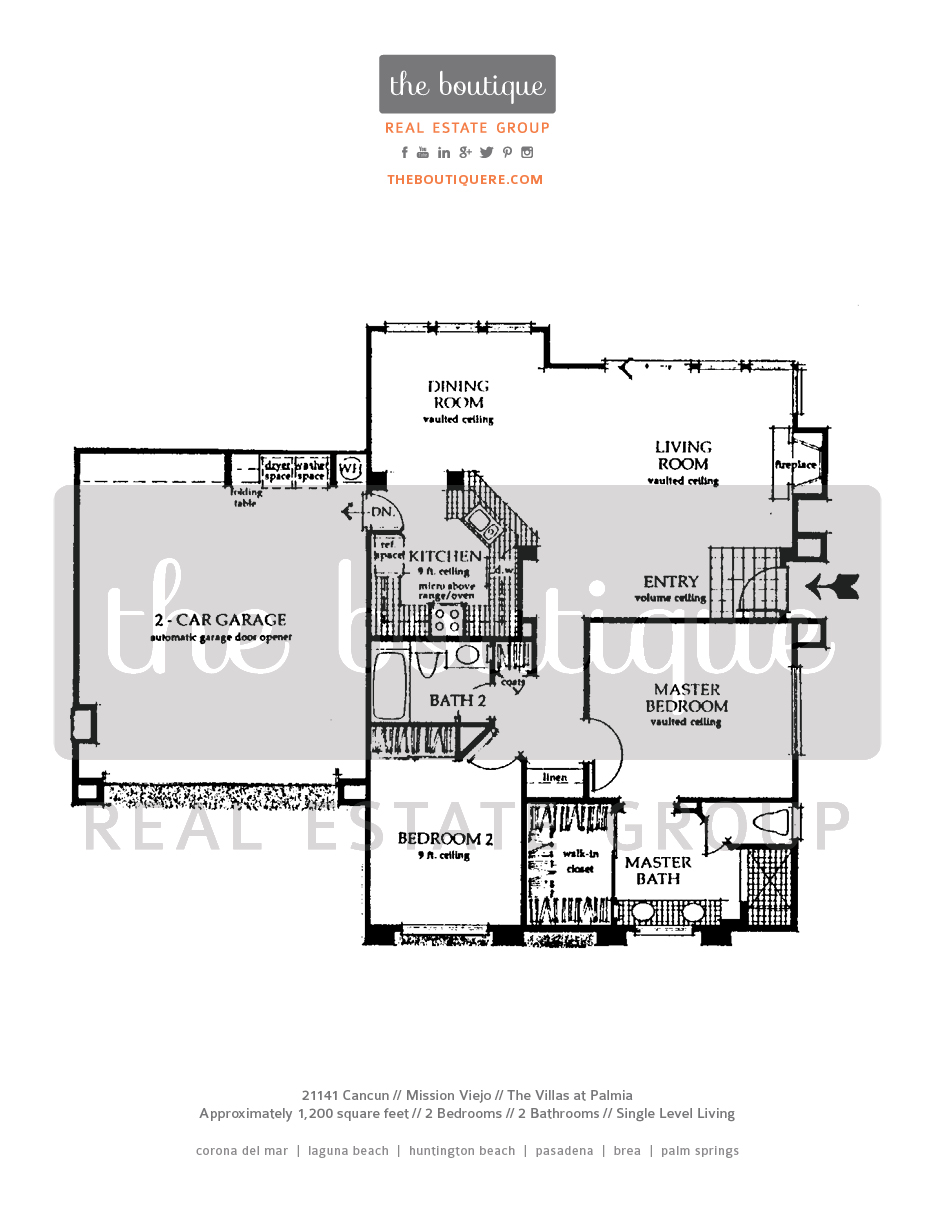 Welcome to 21141 Cancun in Mission Viejo in the 55+ Active Adult Guard Gated Neighborhood of Palmia. Walk into this single level home and immediately you are impressed with the open floor plan featuring approximately 1,200 square feet of living space with two bedrooms and two bathrooms. Natural light fills the space as you are greeted by the cozy fireplace in the living room, tall ceilings and the span of windows that showcase the professionally landscaped grounds of this home. The kitchen is a delightful retreat with upgraded counters & appliances and a separate kitchen nook, large light filled windows, plenty of storage and also leads to the two car attached garage. The master bedroom flows seamlessly into the master bathroom with dual vanities, shower, walk-in closet. The Villas at Palmia features a gorgeous clubhouse with a pool, spa, billiards, bocce ball, ballroom, social clubs & outings, workout facility, 18 hole putting green and tennis courts. Even membership at Lake Mission Viejo. You will love it here.