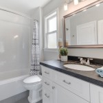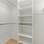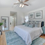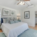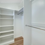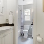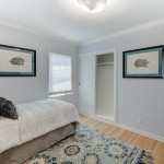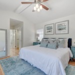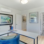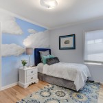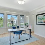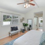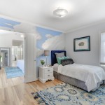 Adjacent to the master bedroom is a space ideal for a child’s bedroom or office, and is accessible by hallway and the master bedroom. An original glass light fixture hangs in the hallway, leading to the third bedroom that is anchored by a large bay window, walk-in closet, and full bathroom.