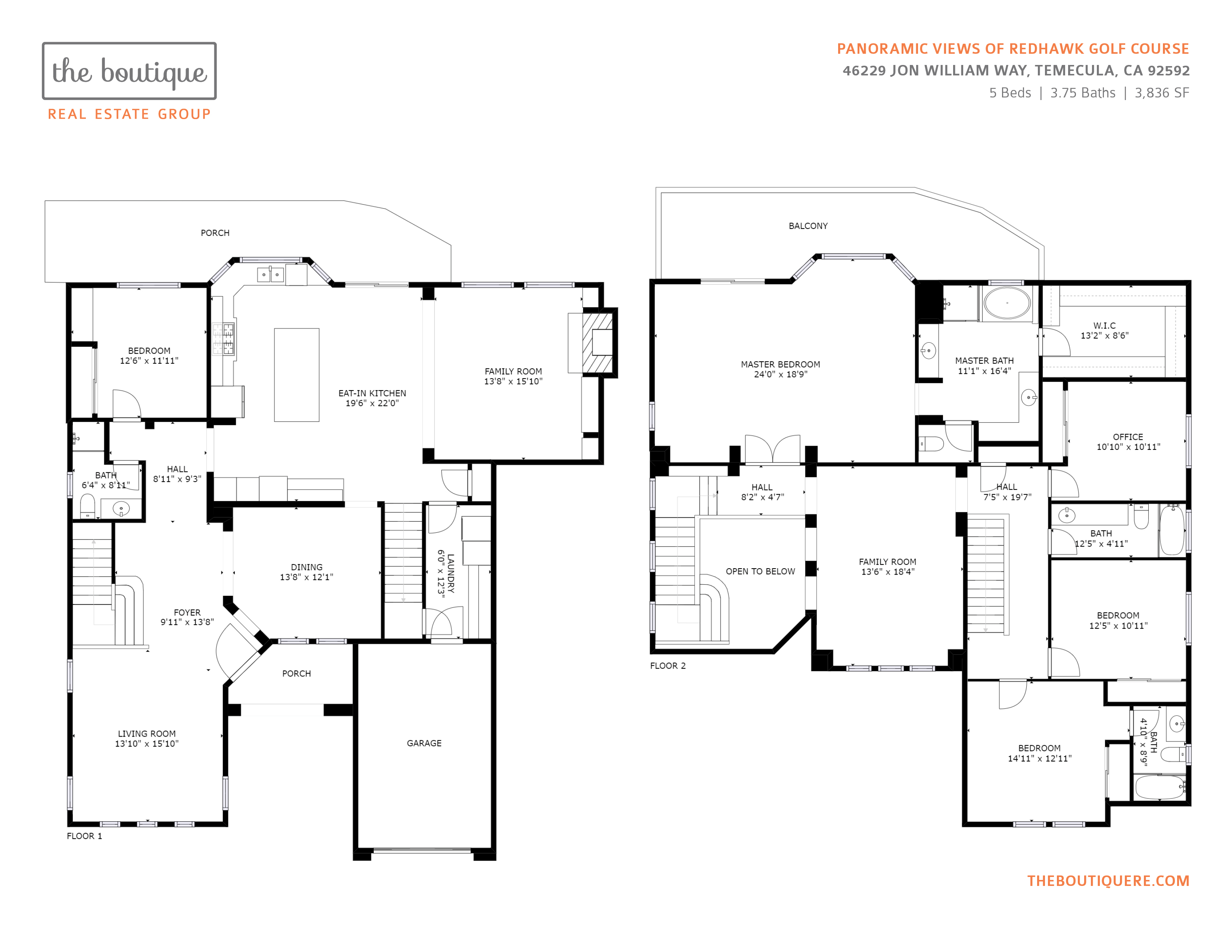 EXECUTIVE GOLF COURSE VIEW HOME || 46229 Jon William Way is a gorgeous model perfect home in the heart of Temecula, located in the Collection Community of Redhawk and sits along Red Hawk Golf Course at the Tee’s on 13.  This home spans approximately 3,836 square feet of living space and includes 5 Bedrooms, 4 Bathrooms, family room, bonus rom, formal living room, formal dining room, secondary staircase, and separate laundry room.  Features include a large entry area which leads to the formal living room, dining room, and main staircase.  This open floor plan includes a gourmet kitchen with island and granite counters.   A casual eating area flows into the family room with fireplace and built-in shelving.  Fabulous tiled balcony off the master bedroom to enjoy upper level panoramic views of the golf course and hillside.  Beautiful hardwood floors in upstairs hall, bonus room and master bedroom.  The master bath has dual vanities, a soaking tub, tiled floors and a large walk-in closet.  A secondary bedroom suite is also located upstairs.  Also included are mirrored wardrobe closets, ceiling fans, and a 3-car tandem garage.  Walking distance to elementary school and Great Oak High School which offers an International Baccalaureate® (IB) program.