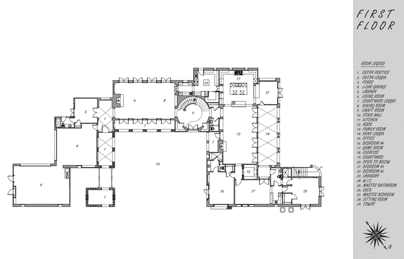 The villas dotting the hilltops in Andalusia, Spain provided the stimulus for this custom built residence nestled into the Northeast Slope of this Southern California coastal foothill known as Shady Canyon in Irvine. A thoughtful compilation of simple horizontal white washed building forms, brick elements, pointed arches, and moorish tile accents are evocative of an unintended complex of buildings evolved over multiple generations. This private & gated 1.15 acre site is punctuated with several natural rock outcroppings that the floor plan layout playfully incorporates as focal design points.